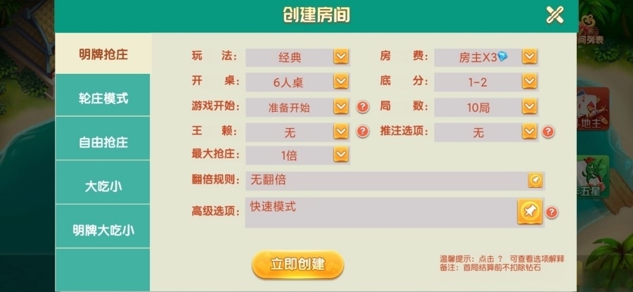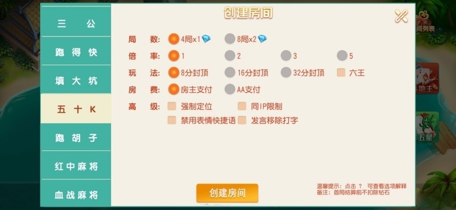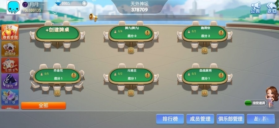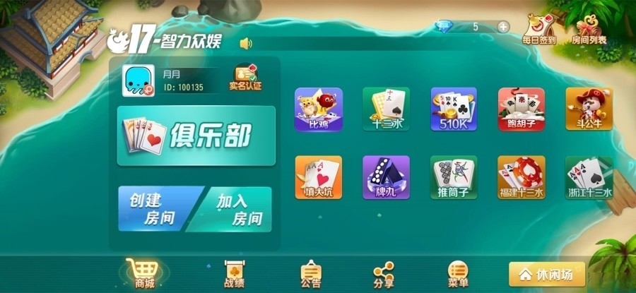 游戏:牛牛,三公,炸金花,跑得快,斗地主,十三水,福建十三水,浙江十三水,血战麻将,长沙麻将,比鸡,推筒子,贵州麻将,红中麻将,卡五星,510K,跑胡子,斗公牛,填大坑,牌九,十点半