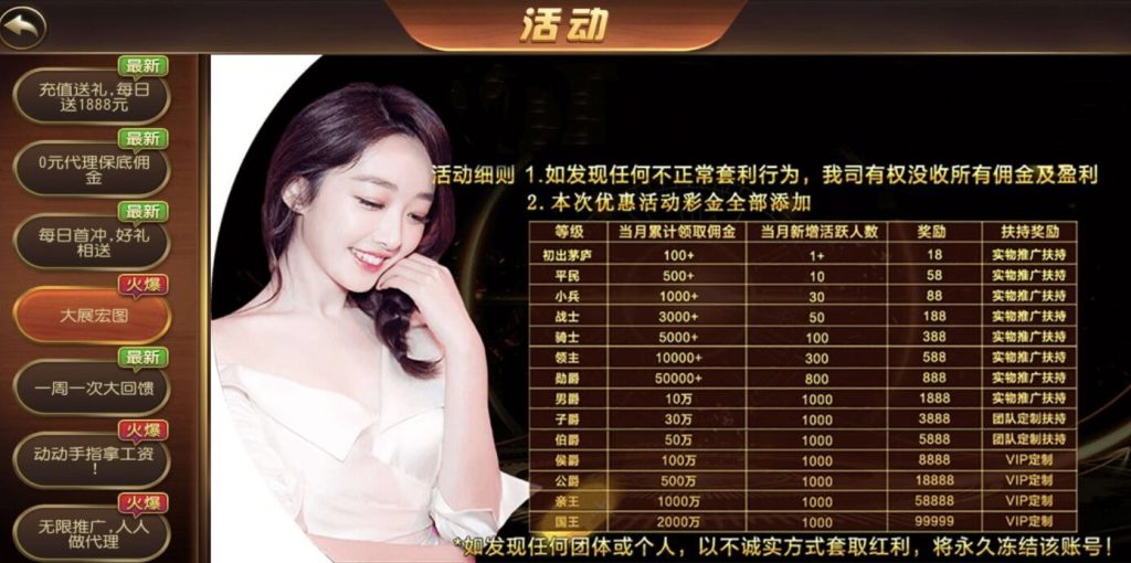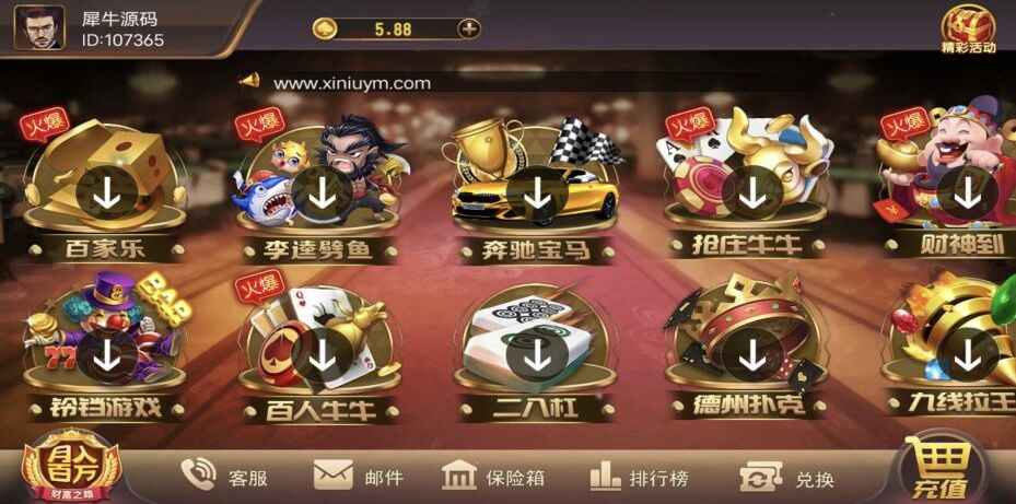 子游戏:炸金花、飞禽走兽、斗地主、红黑大战、龙虎斗、金蟾捕鱼、百家乐、李逵劈鱼、奔驰宝马、抢庄牛牛、财神到、铃铛游戏、百人牛牛、二八杠、德州扑克、九线拉霸