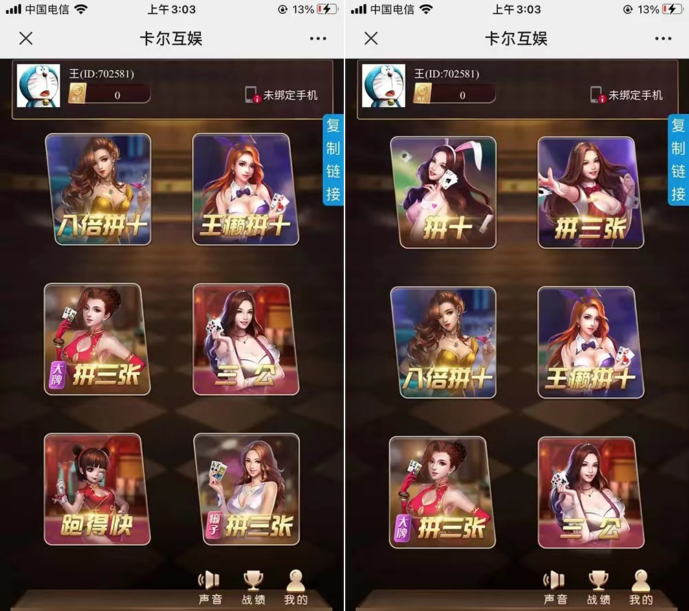 H5大厅内含多种游戏:分别有拼十、拼三张、八倍拼十、王癞拼十、三公、跑得快等,玩家自己可以选择玩法规则进行游戏,创建房卡后将消耗房卡数量。