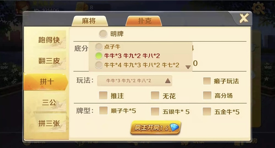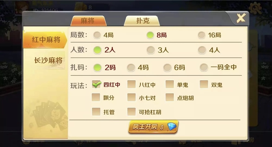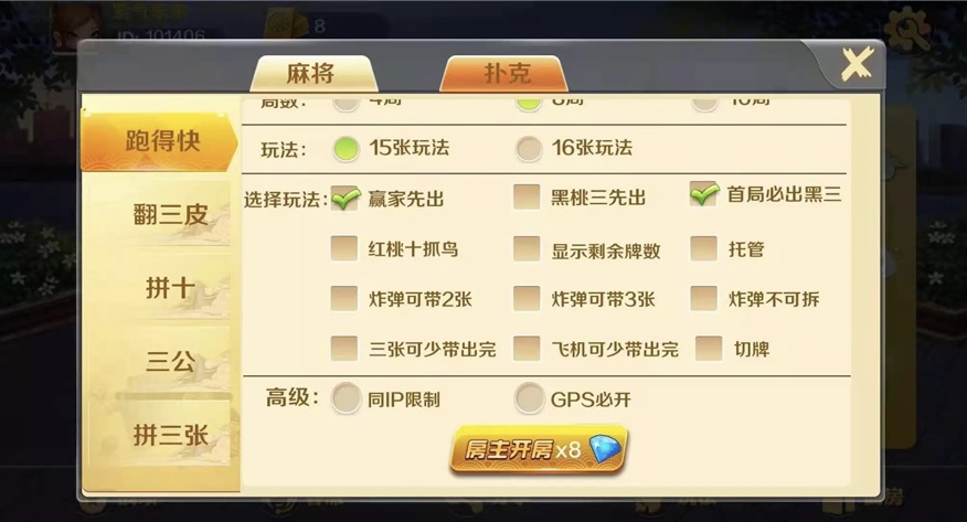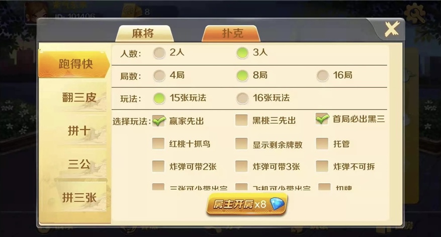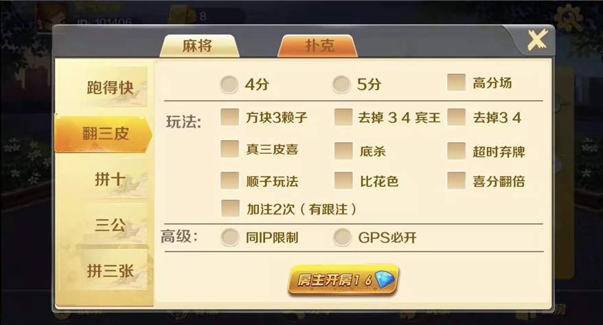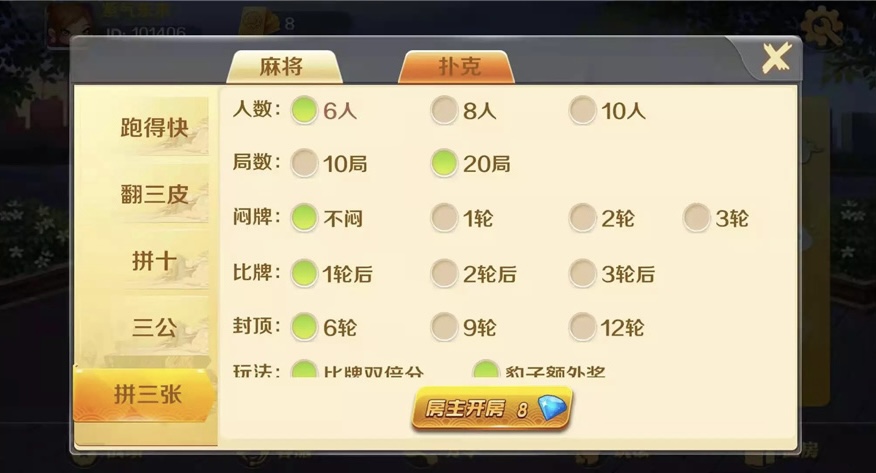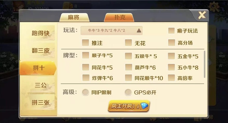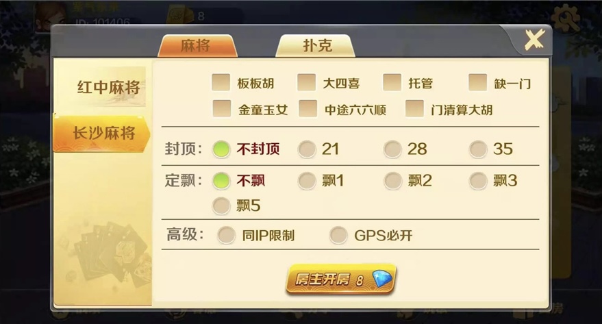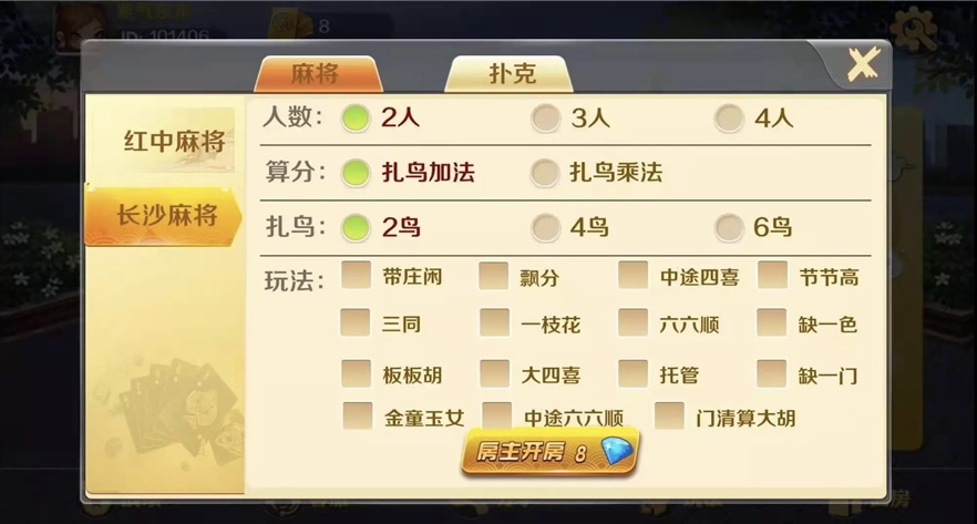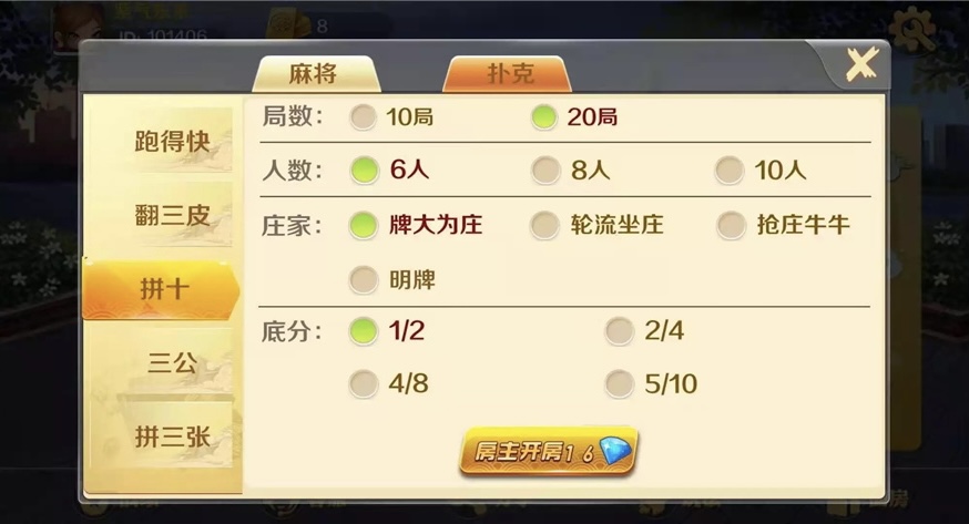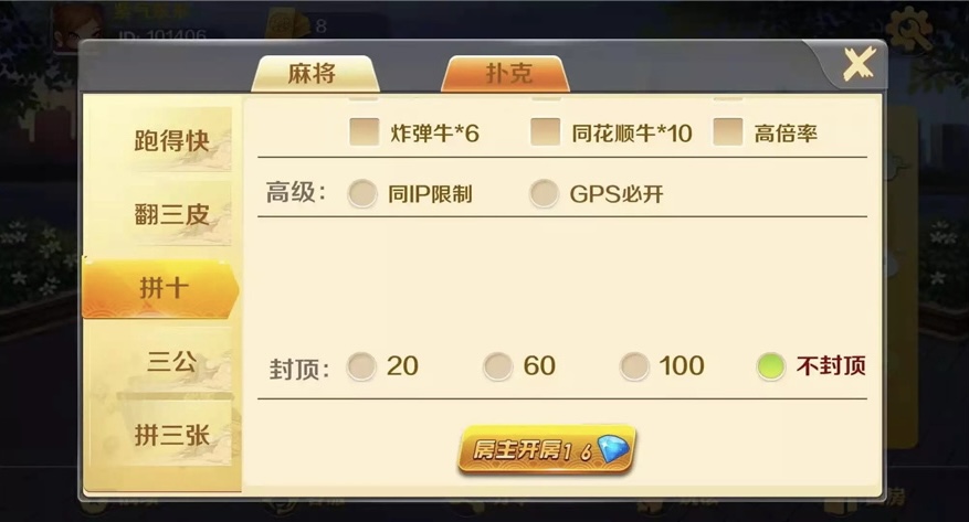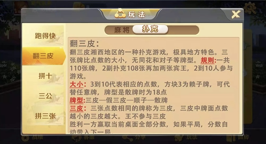 大厅菜单选项:支持游戏回房(即使玩家返回大厅界面,点击回房立即将转到之前加入游戏的牌桌),其余菜单功能支持玩家查看游戏战绩记录、在线联系客服、游戏分享、游戏玩法帮助浏览、以及帐号设置等选项。