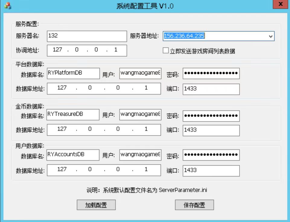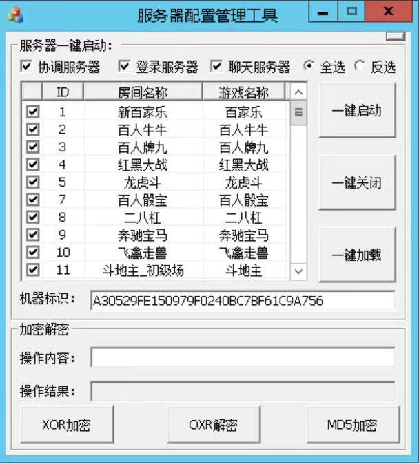 网狐的服务器配置管理工具+系统配置工具,获取机器码的同时,有XOR加密,OXR解密,MD5加密功能,并可以一键启动所有游戏和一键关闭所有游戏,所有网狐同用