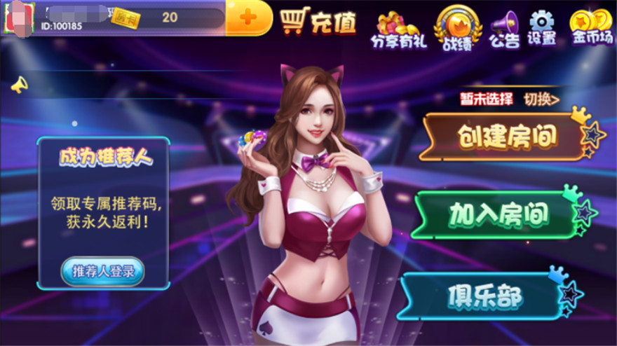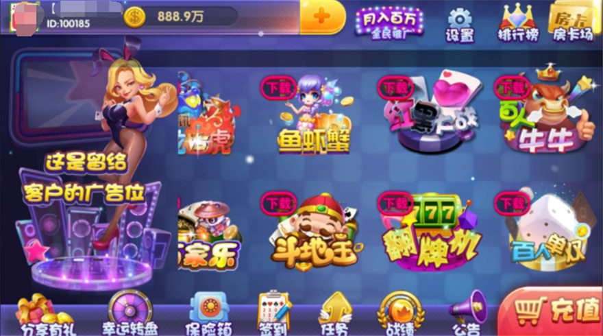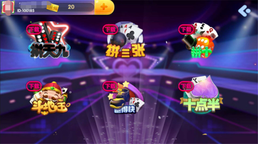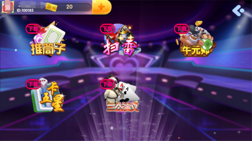 内附游戏:十二款,斗地主、百家乐、水浒传、炸金花、红黑、龙虎、抢庄牛牛、百人牛牛、二人麻将、德州扑克、跑的快等