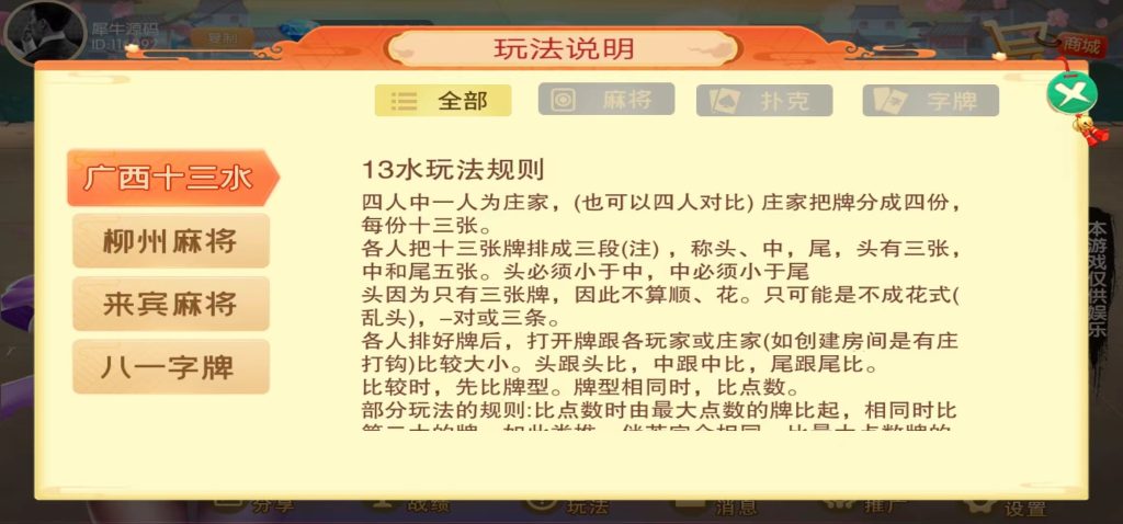内置游戏:来宾柳州麻将 十三水 八一字牌。带占位机器人,服务端有授权。通用搭建教程广西玩法视频搭建教程