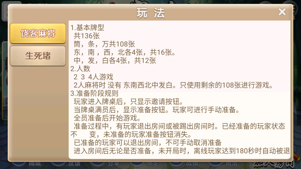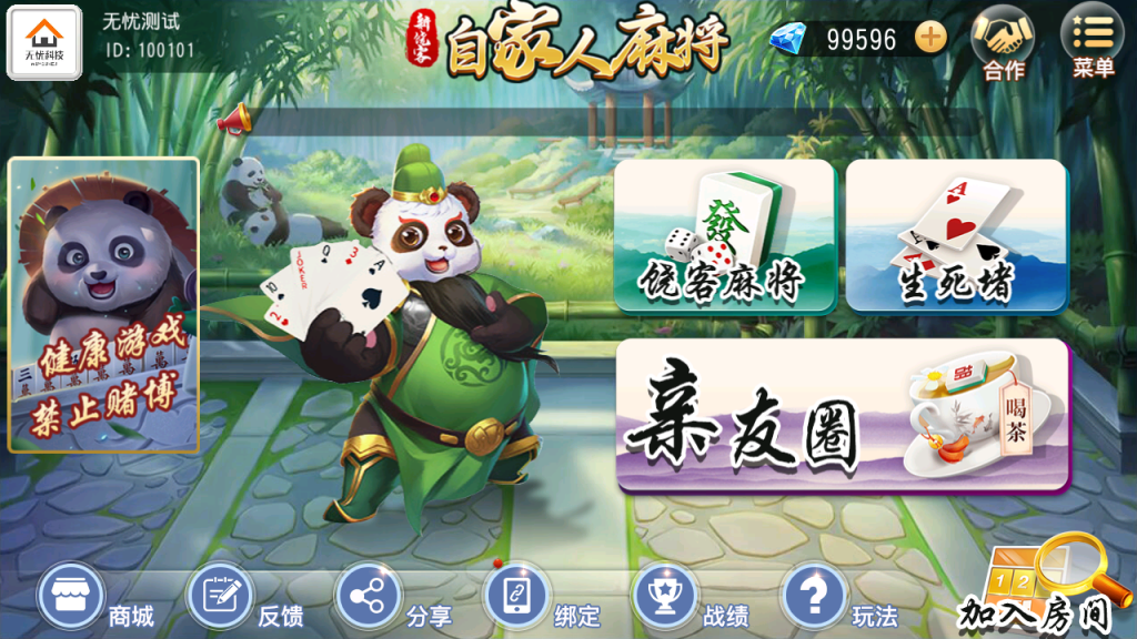 房卡带亲友圈,游戏:饶客麻将、生死猪、挖底