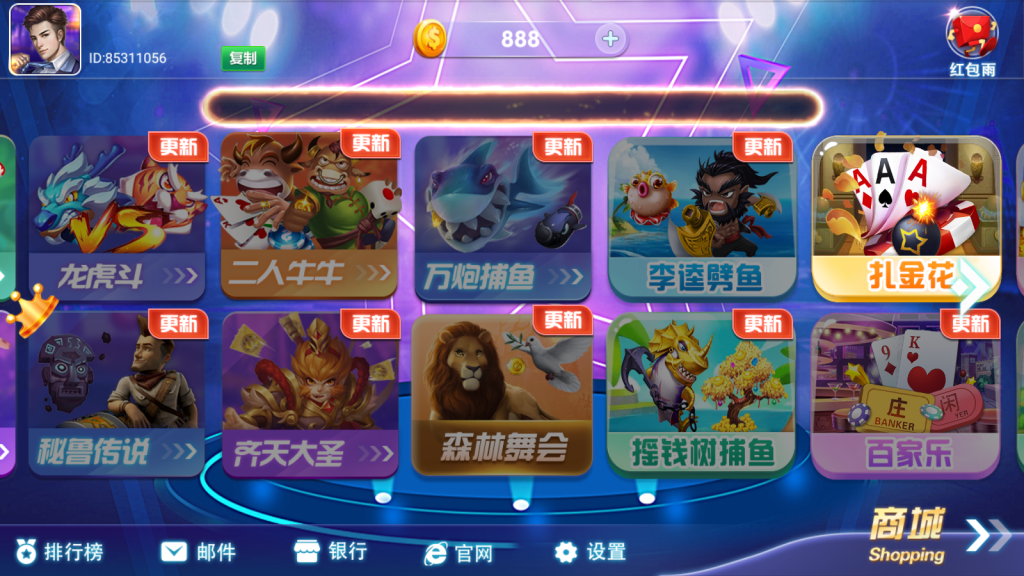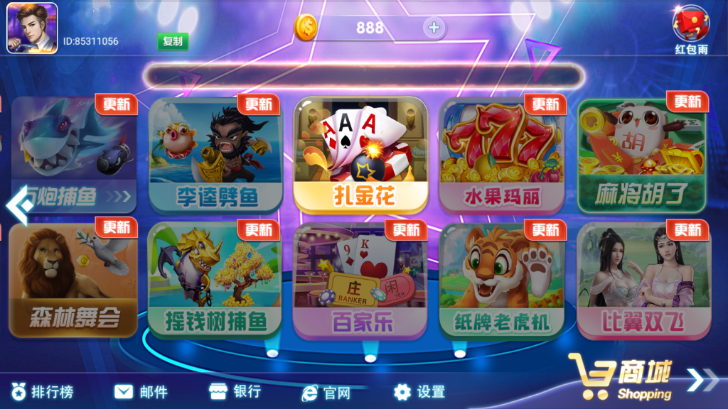 内含游戏:新秘鲁传说、潘金莲、跳高高、百人牛牛、九线拉王、财神驾到、梁山伯、大战僵尸、龙虎斗、秘鲁传说、二人牛牛、齐天大圣、万炮捕鱼、森林舞会、李逵捕鱼、摇钱树捕鱼、炸金花、百家乐、水果玛丽、纸牌老虎机、麻将胡了、比翼双飞