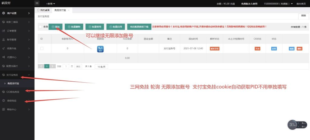 免挂轮询 无限添加账号 收款一次更换一个号 无限轮询,增加QQ收款 QQ免挂 当面付收款