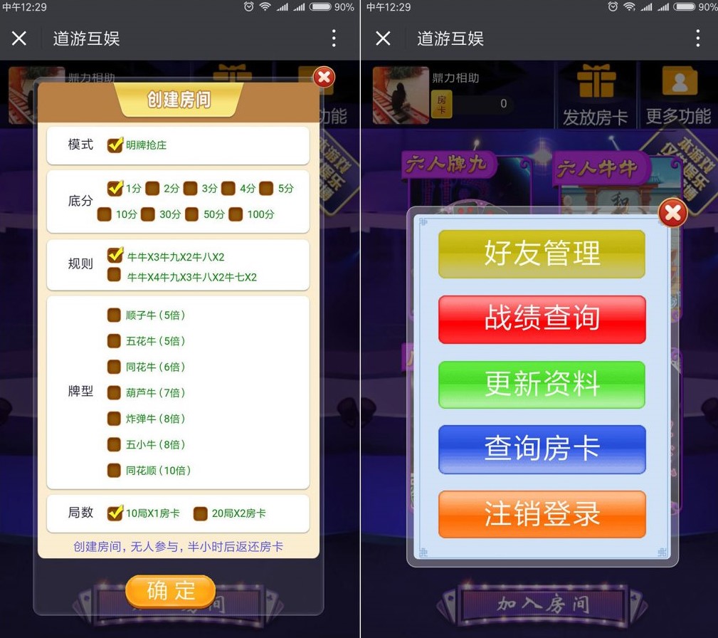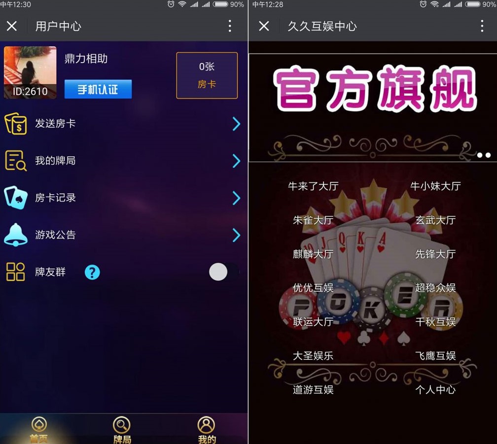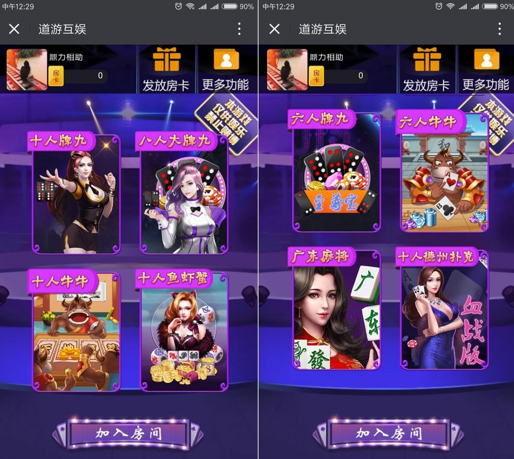 全新H5道游棋牌房卡版源码,包括有多款游戏:十人、八人大牌九,十人牛牛、鱼虾蟹,六人牌九、牛牛,广东麻将,德州扑克。本套源码完整可以运营上线,无任何删减加密,附带安装教程文档。