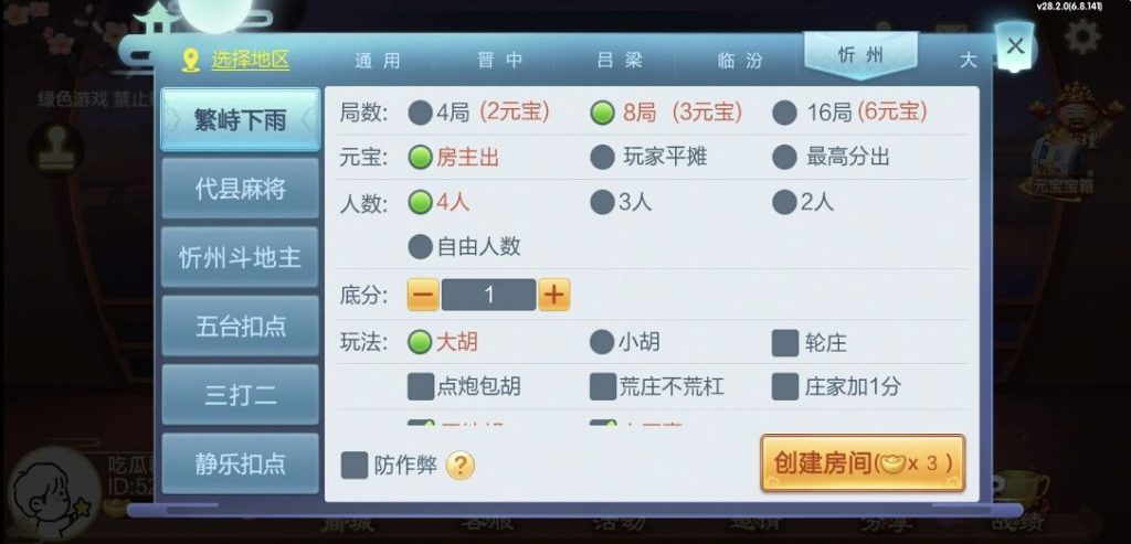 忻州:繁峙下雨、代县麻将、忻州斗地主、五台扣点、三打二、静乐扣点、