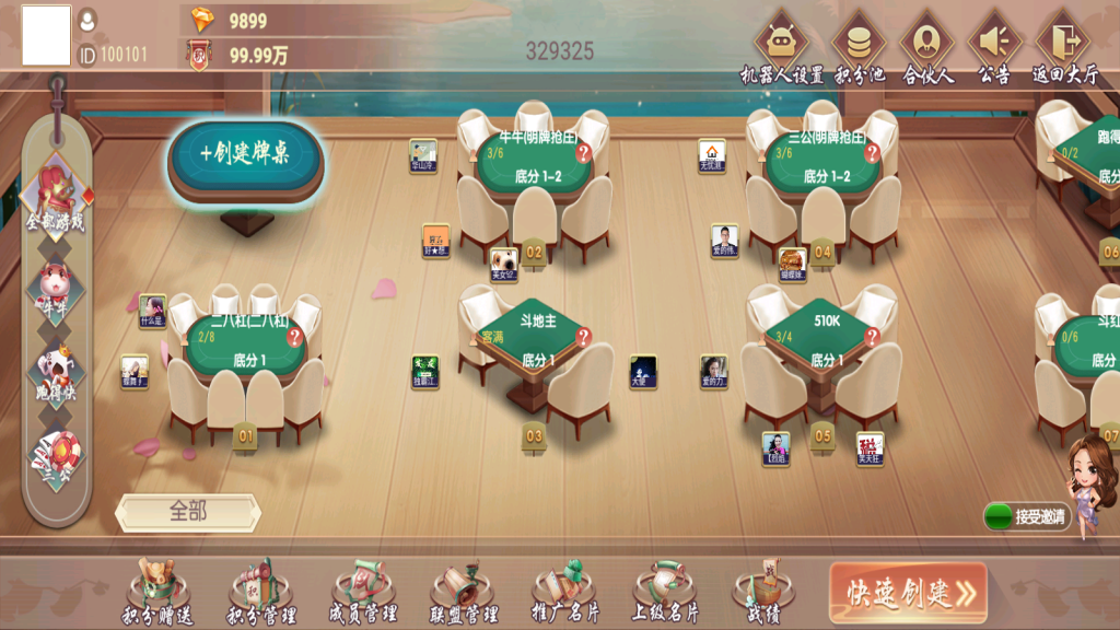 大联盟和俱乐部,带机器人部分游戏带陪玩,其它是占位机器人,游戏带控制。