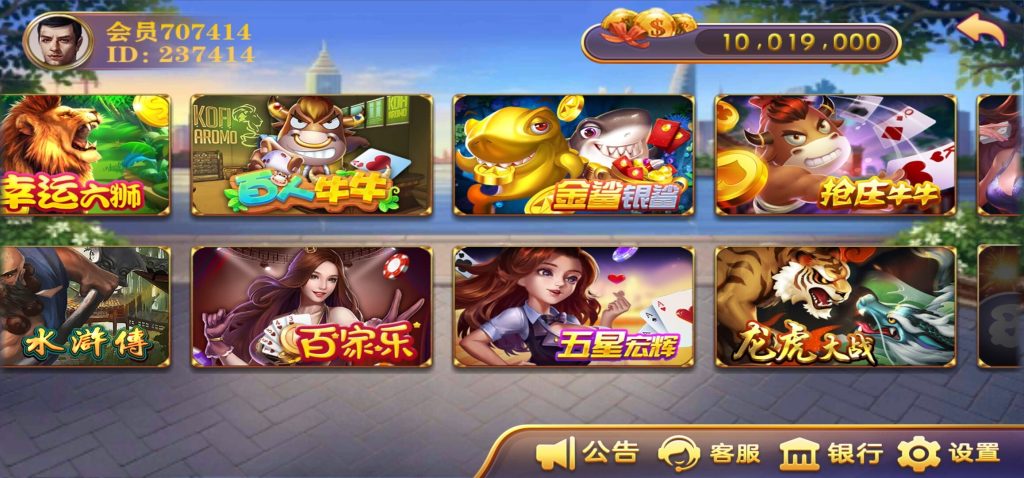 游戏:金蝉捕鱼、神龙宝藏、飞机大战、四海龙王、鳄鱼公园、摇钱树、3D捕鱼、幸运过关、幸运六狮、水滸传、百人牛牛、百家乐、金鲨银鲨、五星宏辉、抢庄牛牛、龙虎大战、炸金花