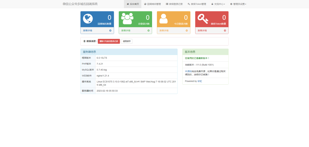 微信公众号后台默认只能授权2个网页域名,用本系统可突破这个限制,用同一个公众号对接无限多个网站。网站后台支持回调域名白名单的管理,以及登录记录的查看。