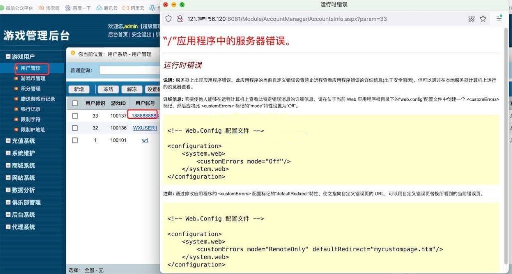 详细信息: 若要使他人能够在远程计算机上查看此特定错误消息的详细信息,请在位于当前 Web 应用程序根目录下的“web.config”配置文件中创建一个 <customErrors> 标记。然后应将此 <customErrors> 标记的“mode”特性设置为“Off”。