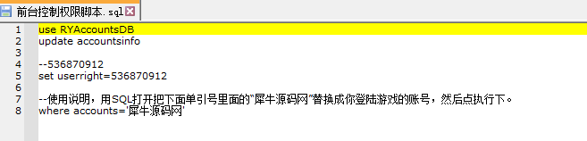 --使用说明,用SQL打开把下面单引号里面的“犀牛源码网”替换成你登陆游戏的账号,然后点执行下。