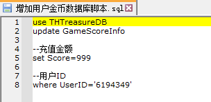 SQLServer数据库增加金币l脚本,脚本些脚本可以单独给指定用户充值,实际应用有所差异,自动修改对应表名。
