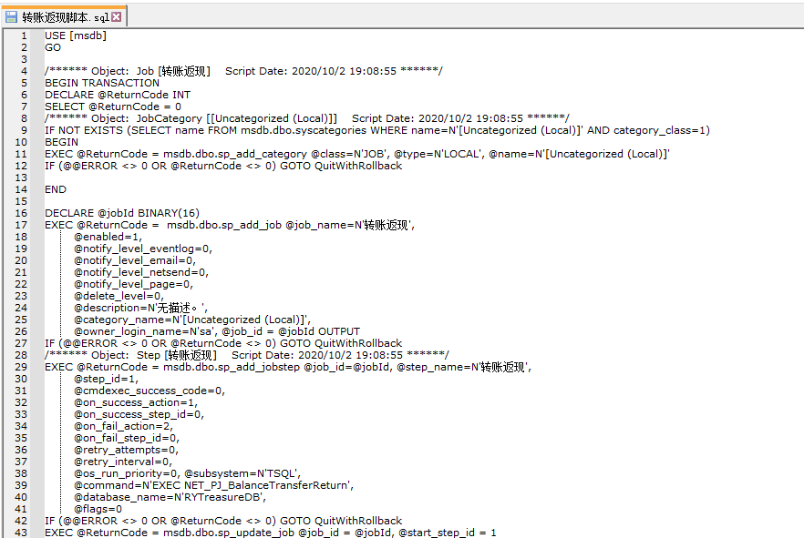 在RYTreasureDB添加一个名为 “转账返现” 的作业步骤,该步骤执行一个名为NET_PJ_BalanceTransferReturn的存储过程。