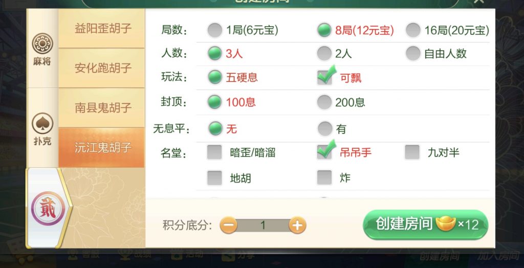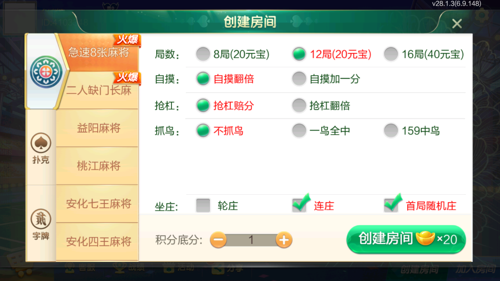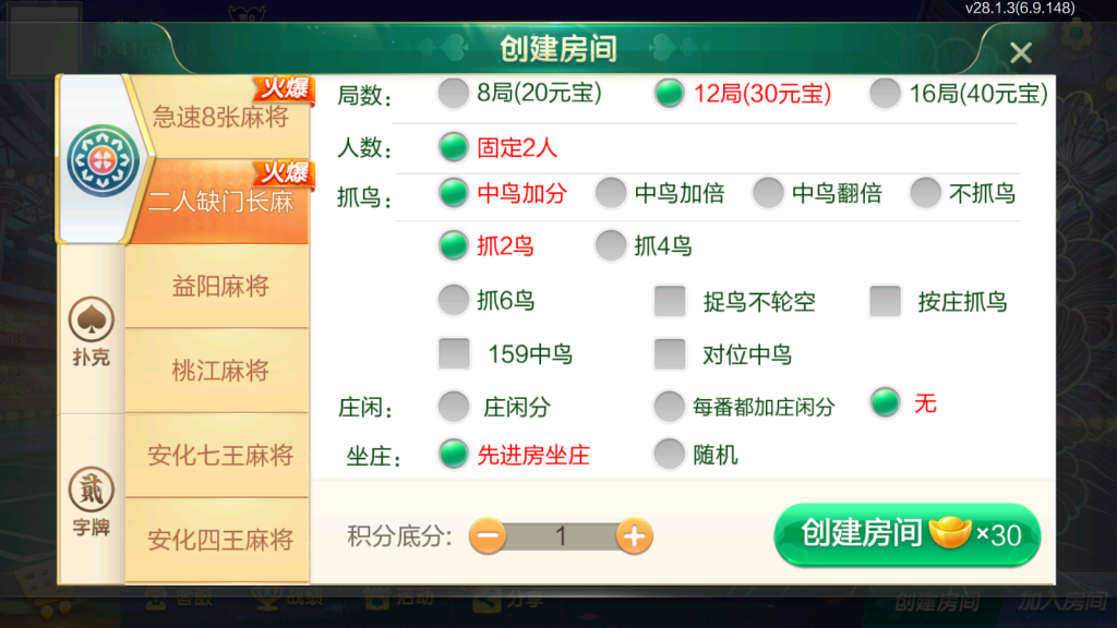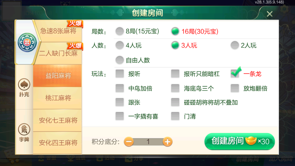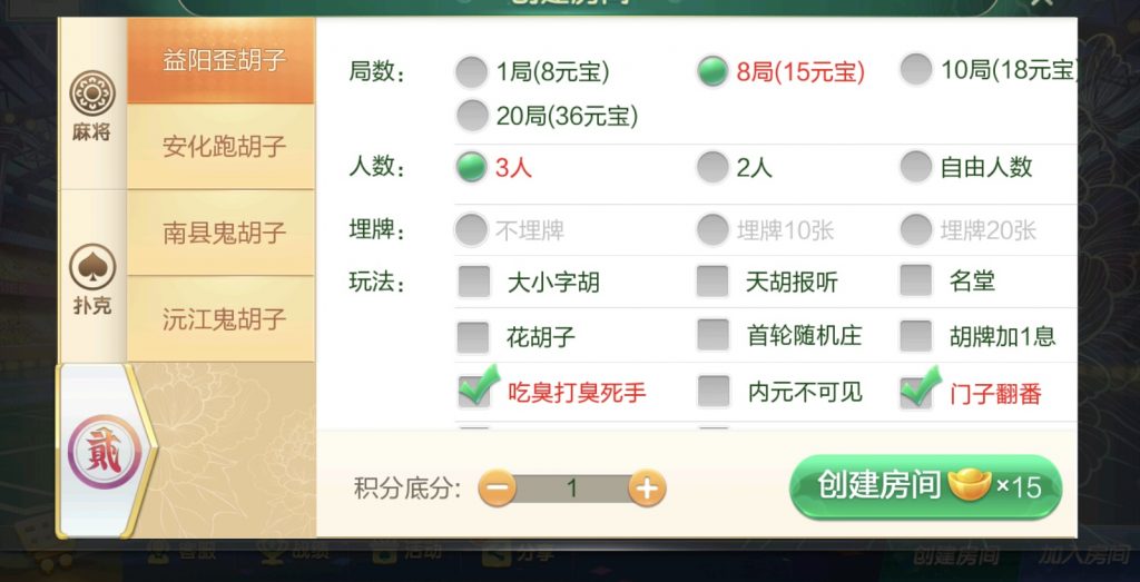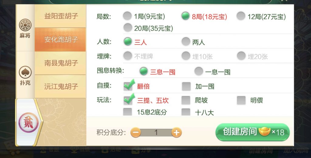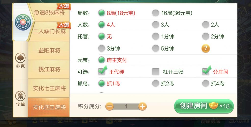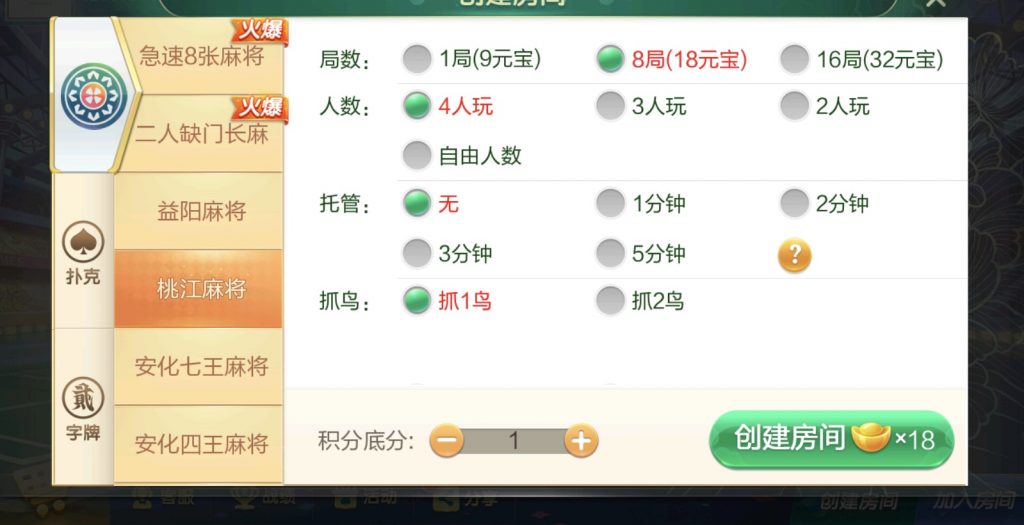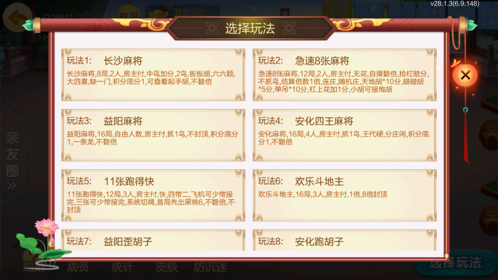麻将:急速8张麻将,二人缺门长麻,益阳麻将,桃江麻将,安化四王麻将,安化七王麻将,红中麻将,沅江麻将,长沙麻将,转转麻将,炒股麻将