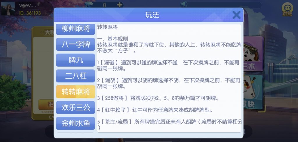 游戏:汉寿跑胡子、快乐牛牛、红中麻将、跑得快、柳州麻将、常德跑胡子、娄底放炮罚、邵阳剥皮、牌九、推锅牌九、八一字牌、快乐三公、新十三水、新余510k、新余麻将、柳州字牌、翻三皮、碰碰胡、泰和过炸、96游戏、老牌、跑胡子、长沙麻将、新化打炸、戳虾子麻将、荆楚花牌、快乐金花、无限斗公牛、沅江鬼胡子、沅江千分、沅江麻将、梅州红中宝