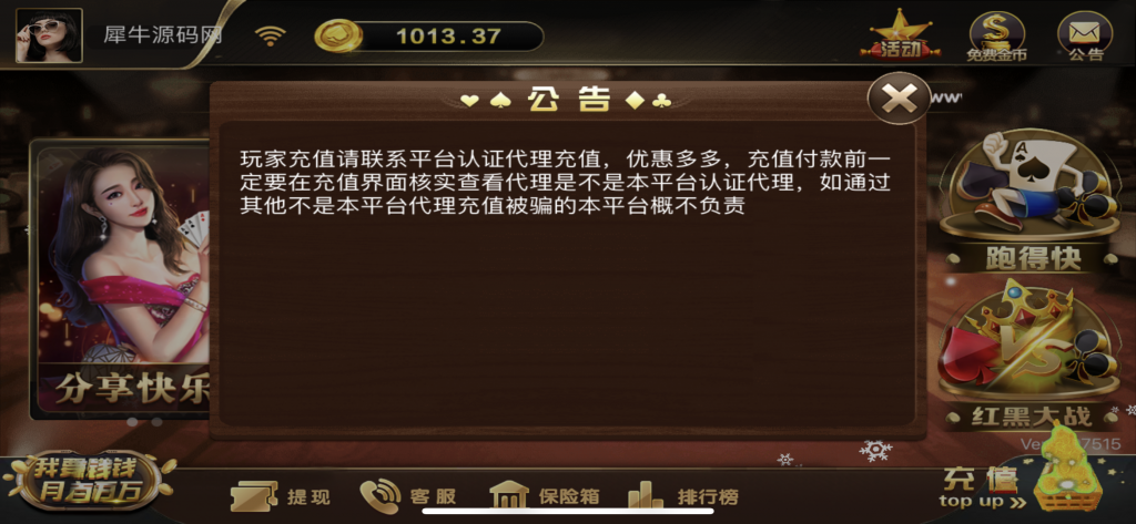 游戏全部玩分别:炸金花 抢庄牛牛 斗地主 龙虎斗 捕鱼达人 百人牛牛 跑得快 红黑大战 飞禽走兽 百家乐 奔驰宝马 骰宝 水果机 轮盘 百人推筒子 红包扫雷 财神到 水浒传 绝地求生