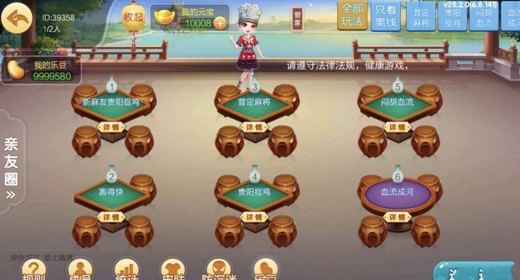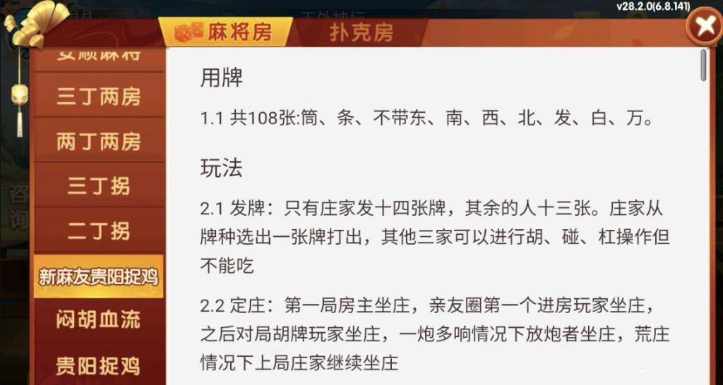 麻将:普定麻将,安顺麻将,三丁两房,两丁两房,三丁拐,两丁拐,新麻友贵阳捉鸡,闷胡血流,贵阳捉鸡